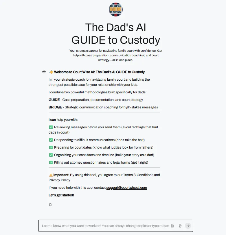 This isn't generic AI. It's trained on the GUIDE + BRIDGE methods, research-based, child-focused, court-aware. It's the system that saved me $30K in a multi-year custody battle.